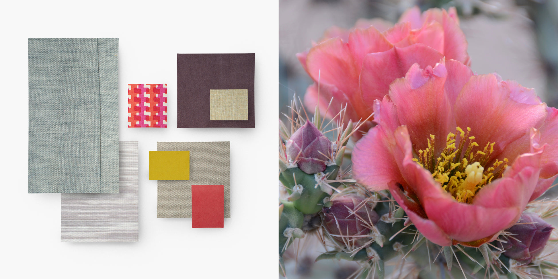 Prickly Pear desert bloom in happy hues of pink and lavender with a cool backdrop medium grey.