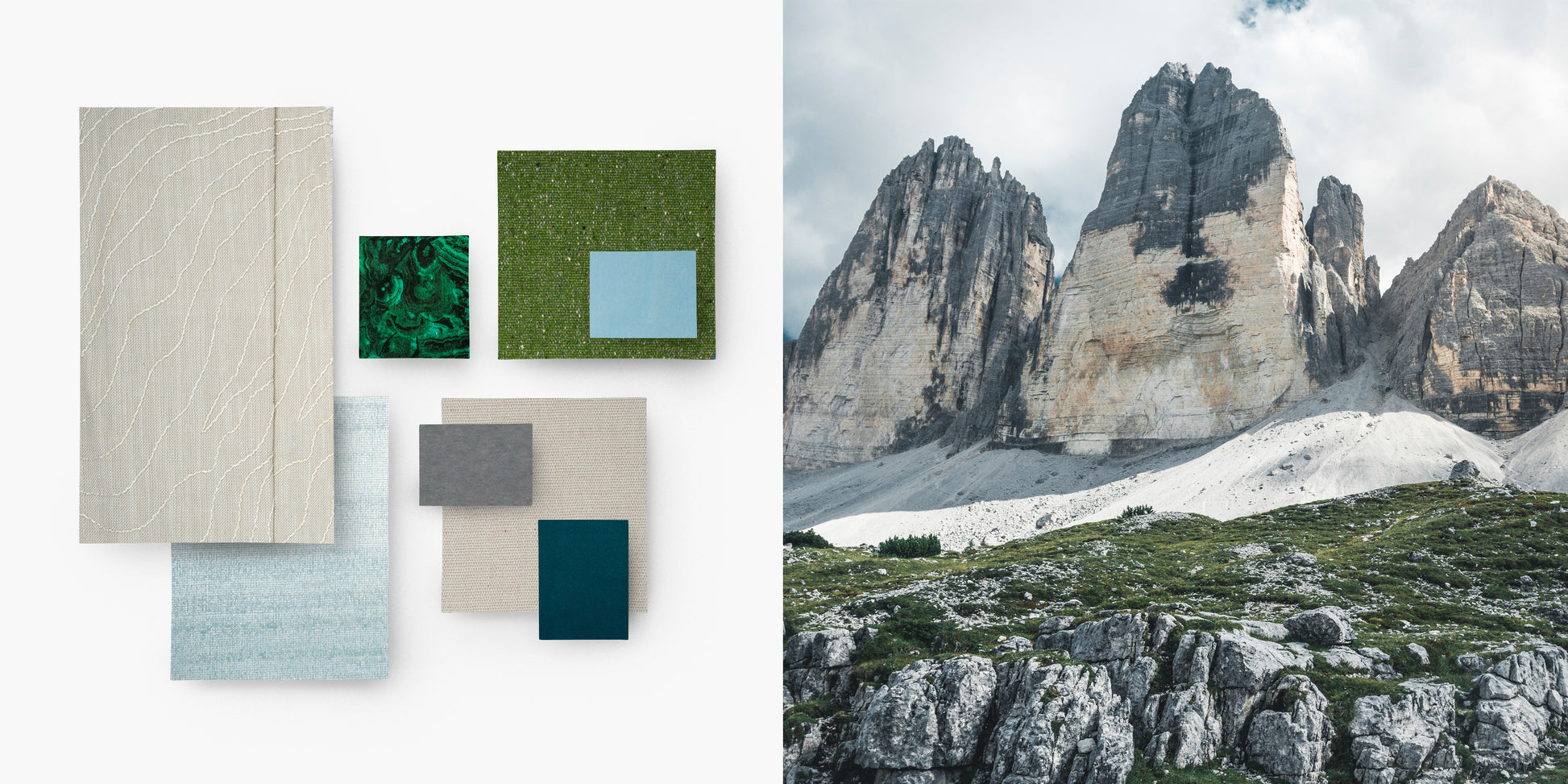 Rugged textures of Dolomite Alps form a dialog between green ground cover, granite peaks and the cloudy sky above.