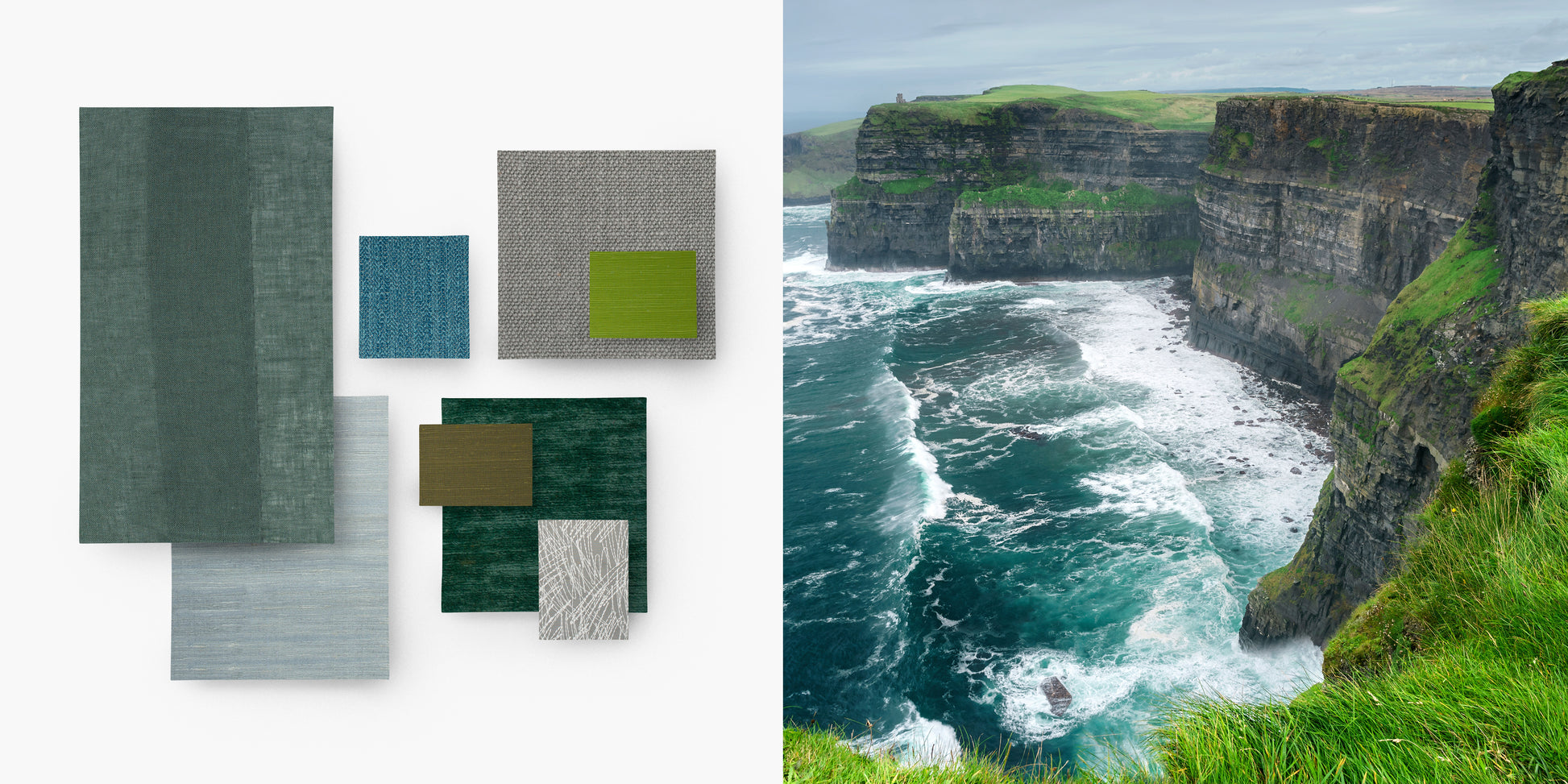 Spectacular views of Cliffs of Moher in Ireland layered with gutsy textures and vibrant shades of grass green, emerald waters and limestone.