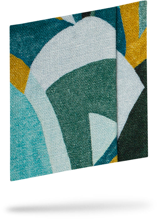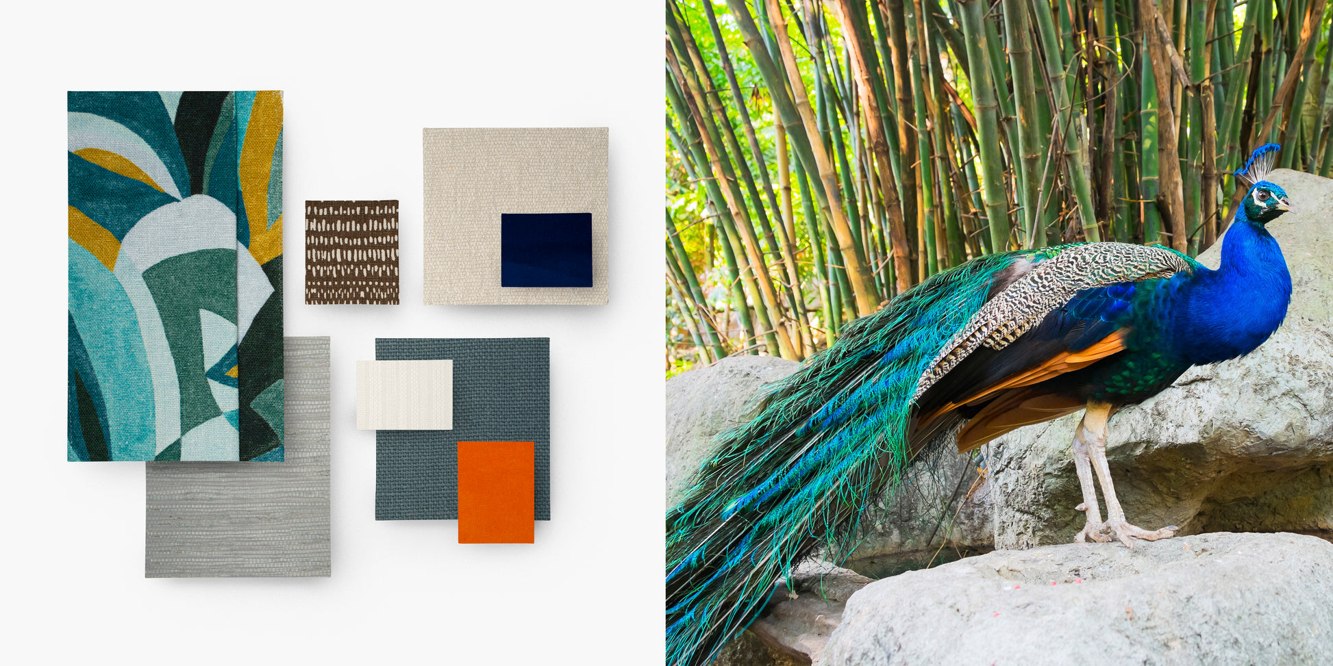 Peacock portrait with primal color blocks of vibrant orange, navy blue and turquoise.