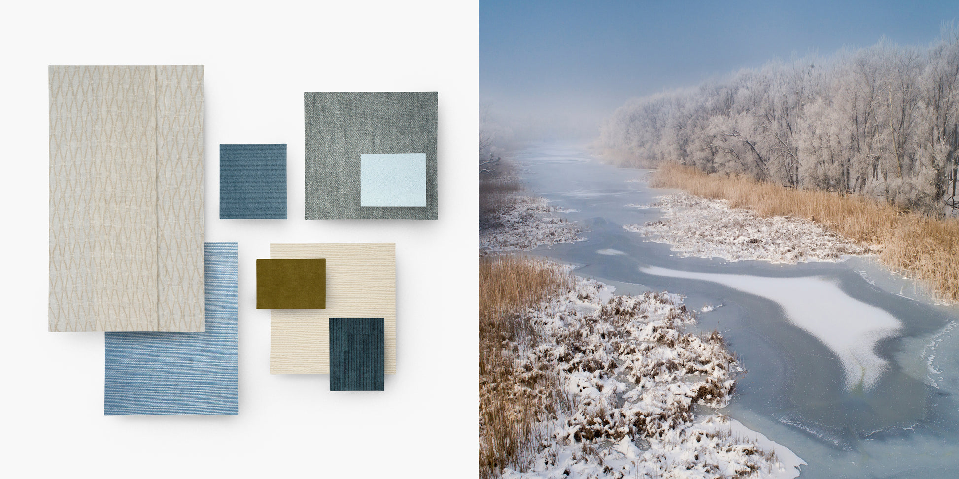 Winter landscape of frosted trees inspire a palette of light blue, sand and taupe.