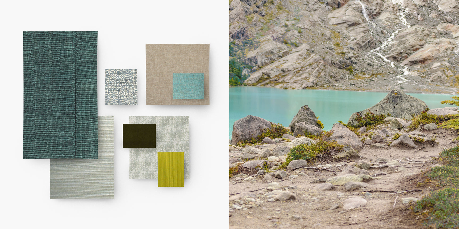 The impossibly vivid blue of Huemul Glacier Lake in Patagonia contrasts craggy grey minerals with rugged underbrush.