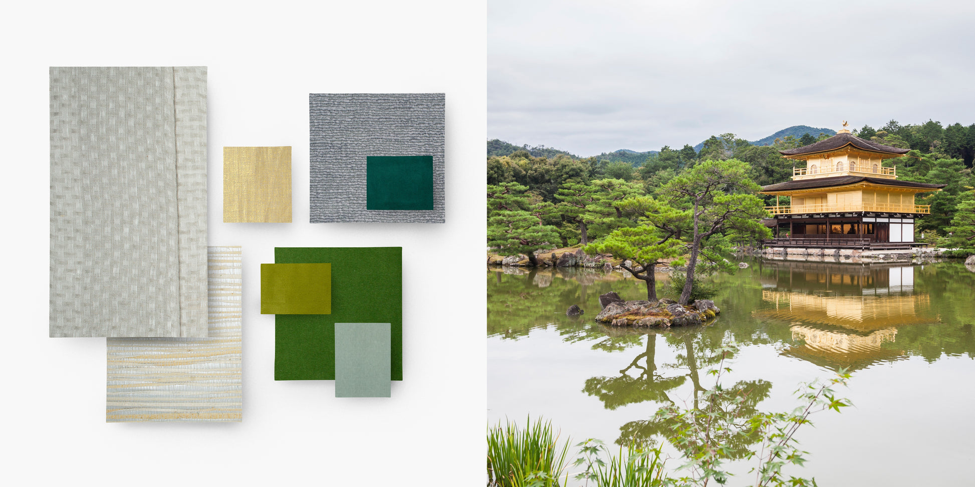 The famous Golden Pavilion temple in Kyoto perched in a tranquil backdrop of saturated greens.