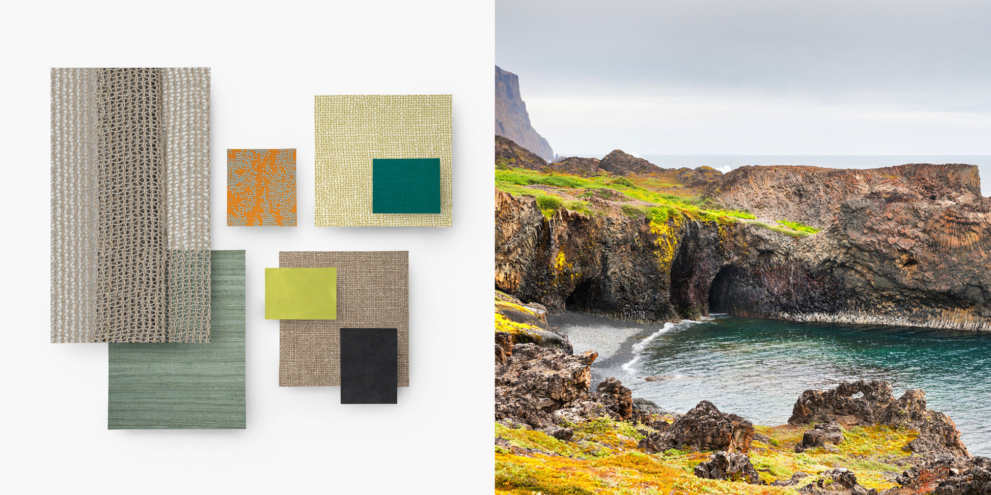 Basalt cliffs, azure blue sea and striking ground cover on the coast of Disco Island, western Greenland.