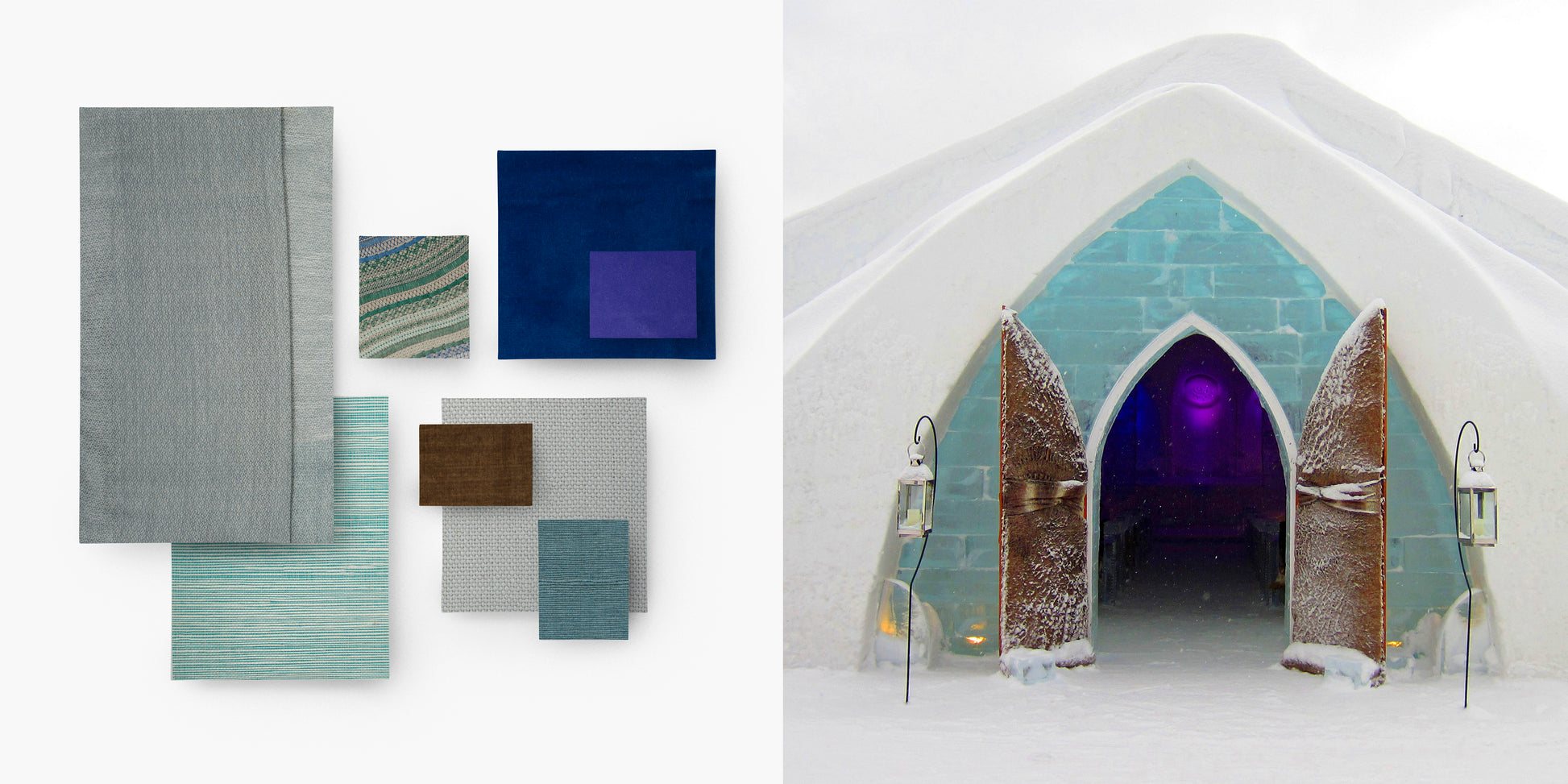 The Ice Hotel in Quebec, Canada features turquoise and pearl grey with intense ink-blue accented with violet.