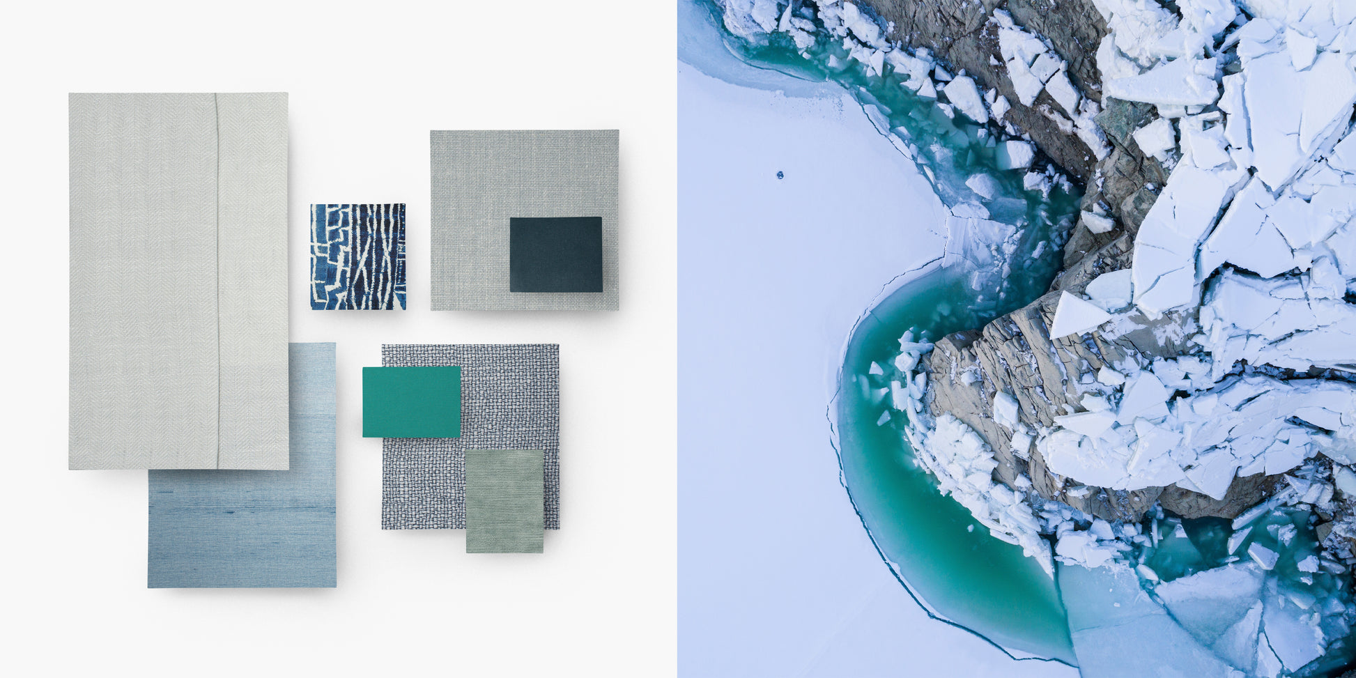 Glacier thaw revealing raw geological textures and delicate cool hues of grey and ice water blue green.