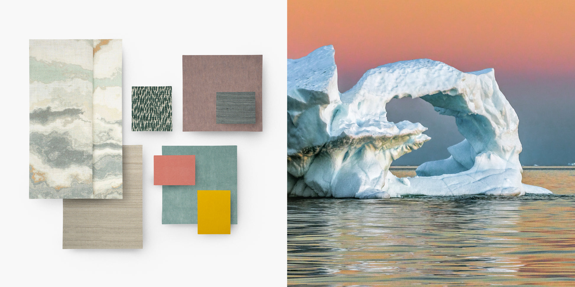 Sunset tranquil view in Western Greenland features watercolor hues of pale grey, soft rose with vibrant pinks and orange.