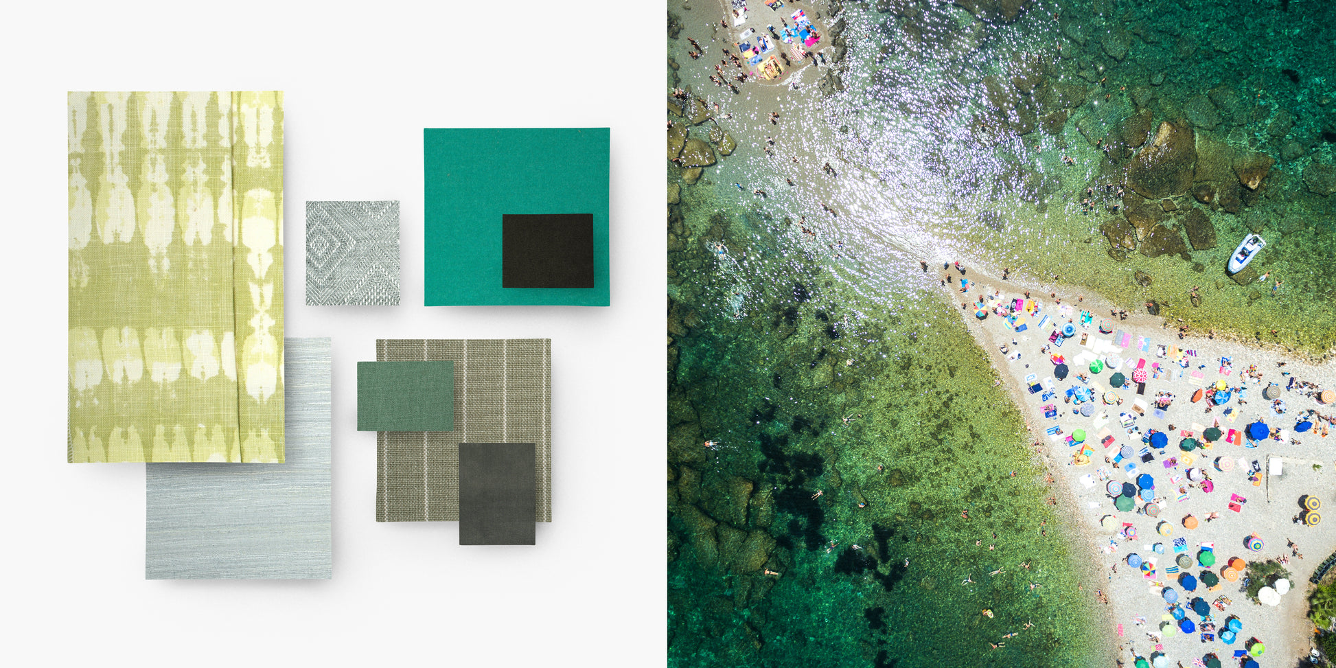 Festive beach day in Isola Bella at Taormina, Sicily features watery greens, sandy textures and undertones of chartreuse.