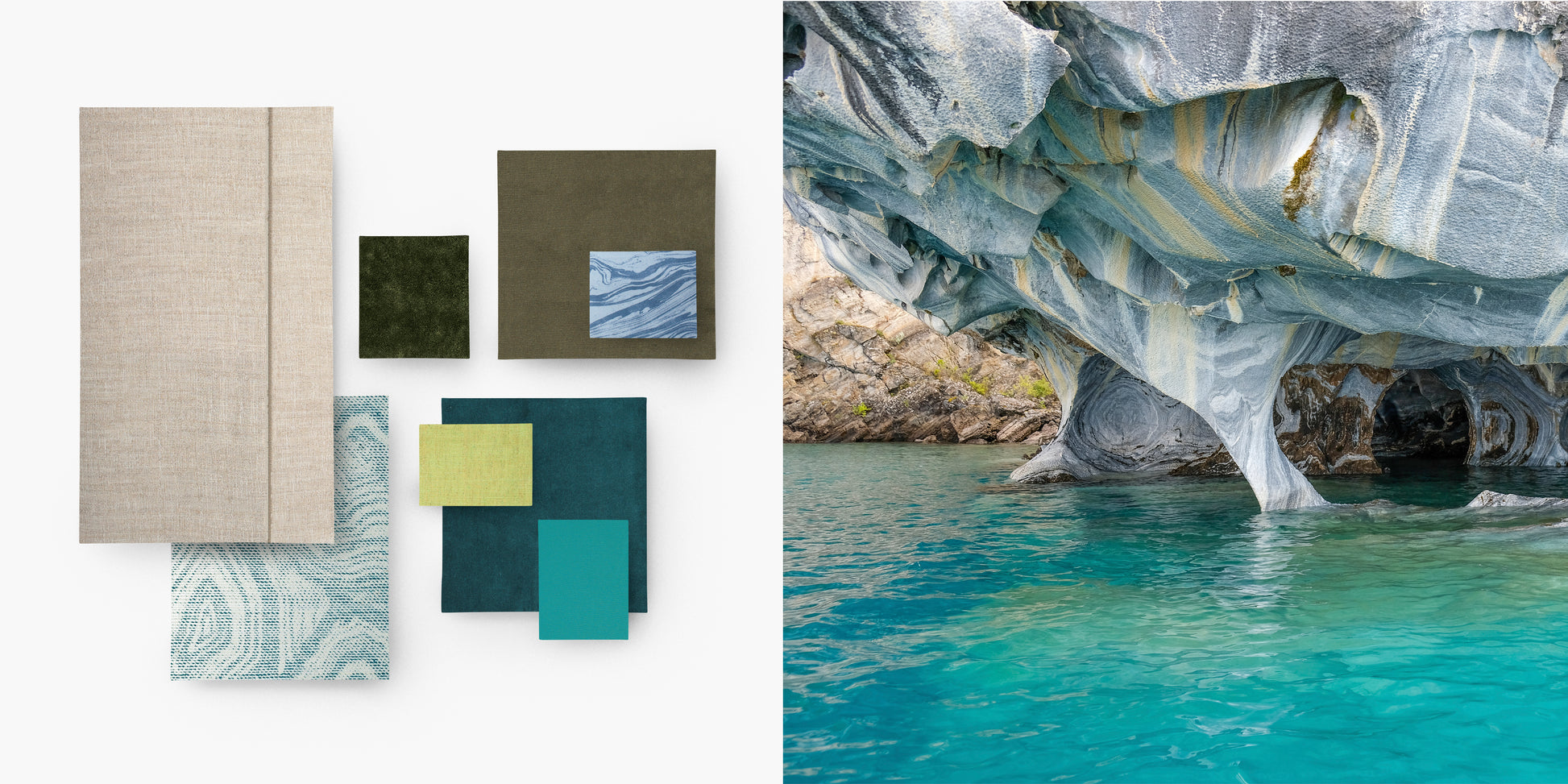 Natural rock formations reflecting saturated hues in General Carrera Lake in Patagonia, Chile