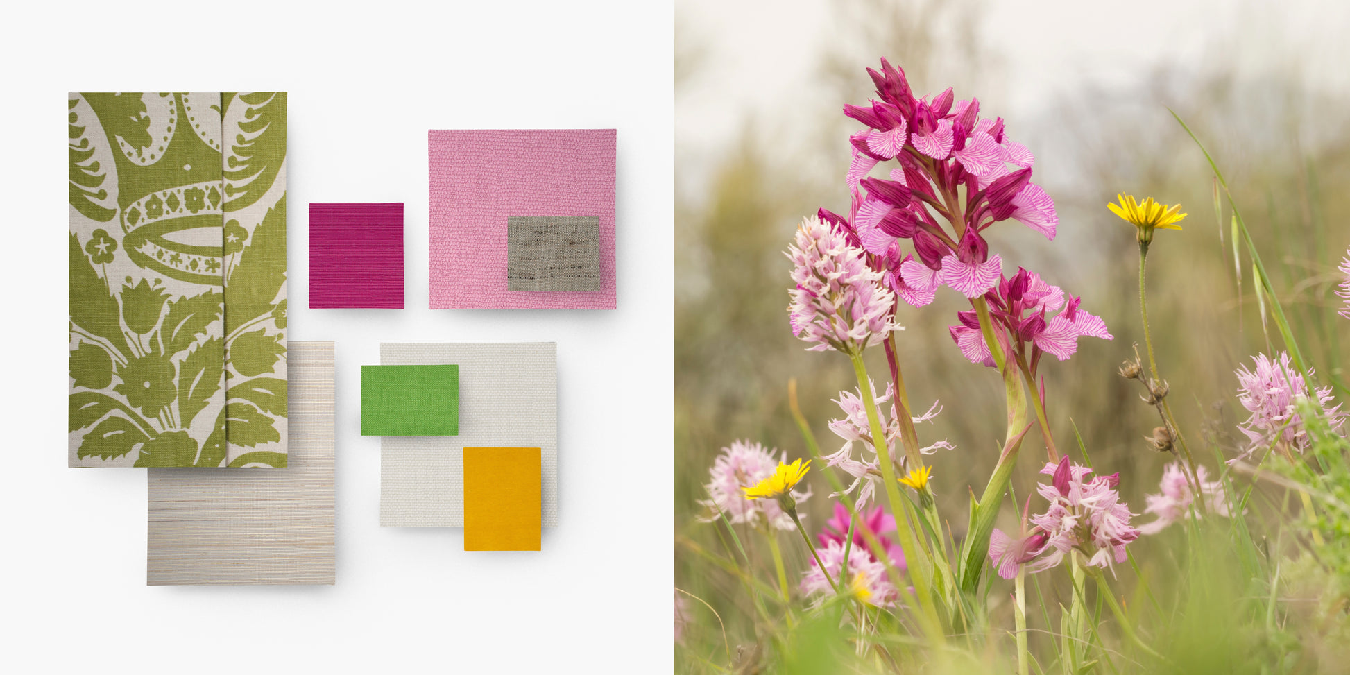 Exotic spring flowers in their natural habitat in shocking pink accented by green grass and yellow flora.