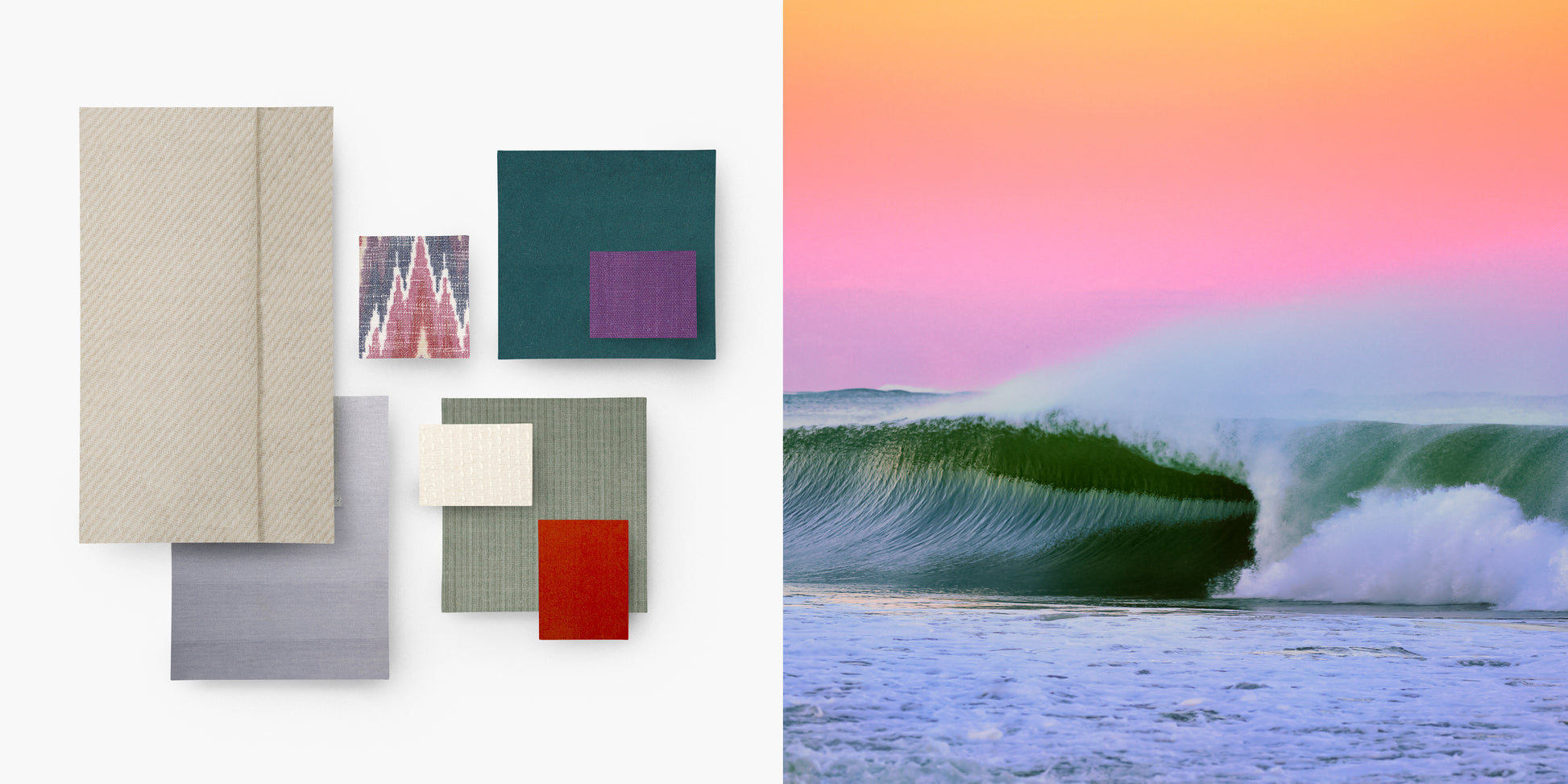 Japan's perfect breaking green waves set off by vivid sunset pastels of orange, violet and pink.