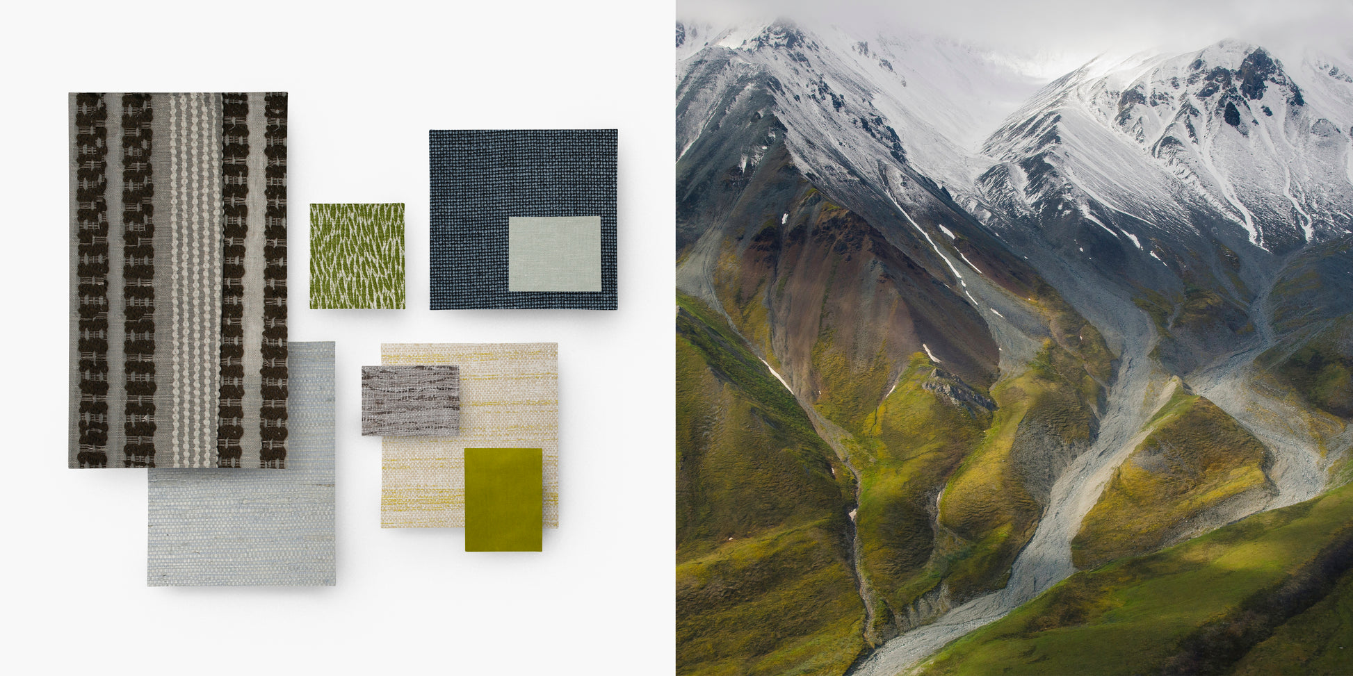 Vivid mountain and valley views with the Spring snowline set up an usual color composition of graphite and shades of olive green.